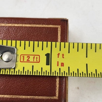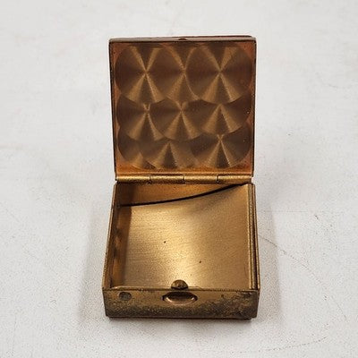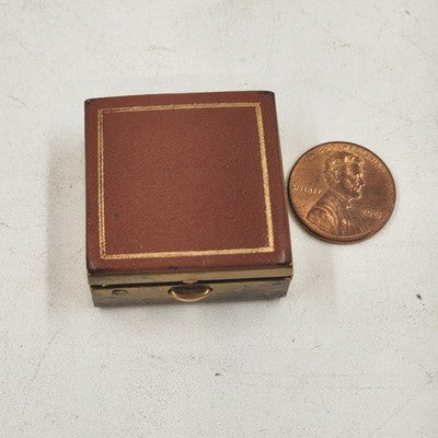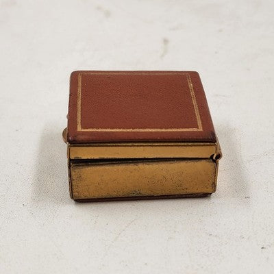 Vintage pill box / trinket jewelry case with a tan faux leather top and bottom accented by a gold metal finish. Compact and elegant, perfect for holding small pills, keepsakes, or jewelry.