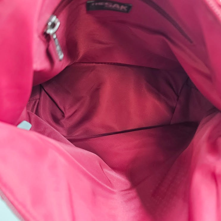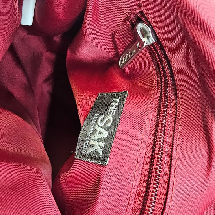 This The Sak woven shoulder bag features a deep red crochet-style body paired with a sturdy leather strap for comfortable carrying. Spacious and stylish, it's perfect for everyday use while maintaining the boho-chic look The Sak is known for.