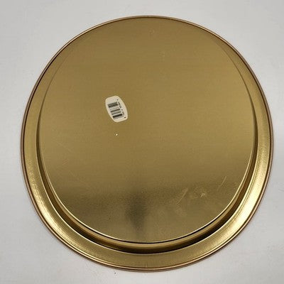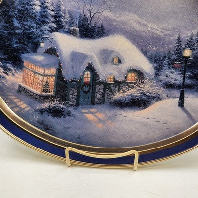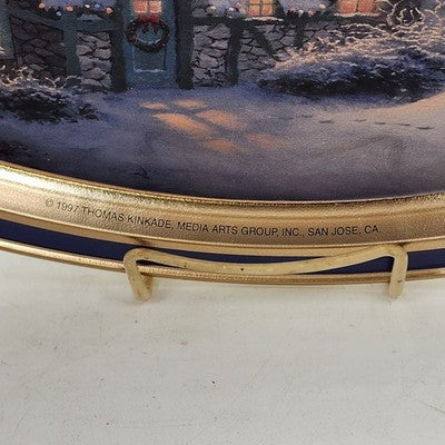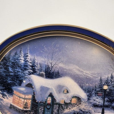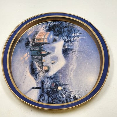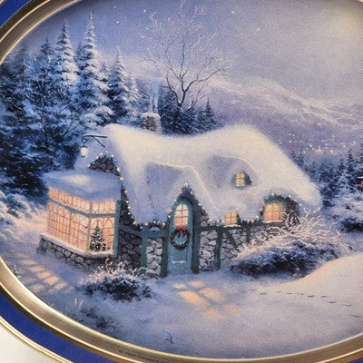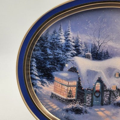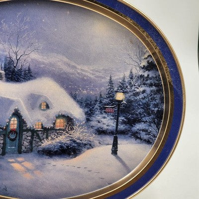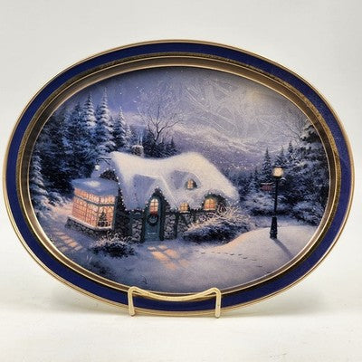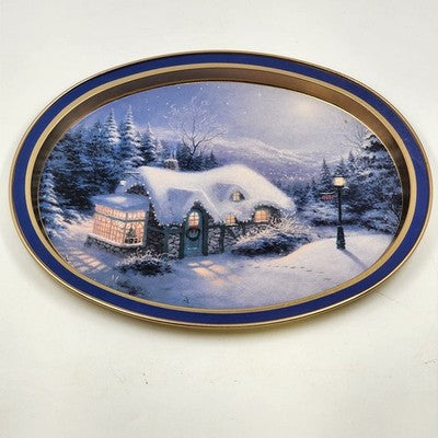 A collectible Thomas Kinkade tin tray featuring a charming Christmas winter cottage scene. This oval tray makes a lovely holiday display piece or serving tray.