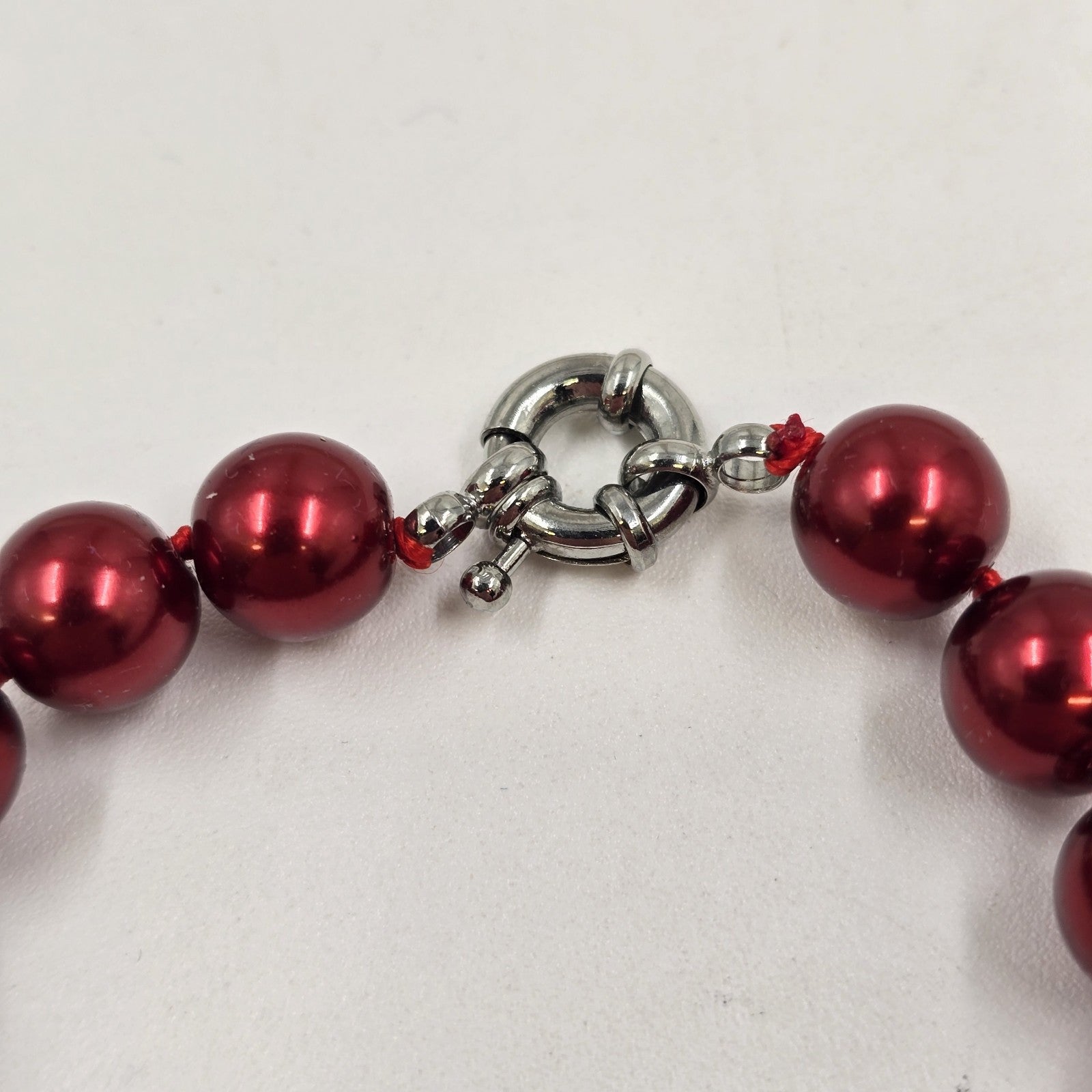 These vintage bracelets include two red and one blue shiny faux pearl beaded designs. Each bracelet is knotted between beads and features a silver-tone spring ring clasp, offering a classic and elegant look.