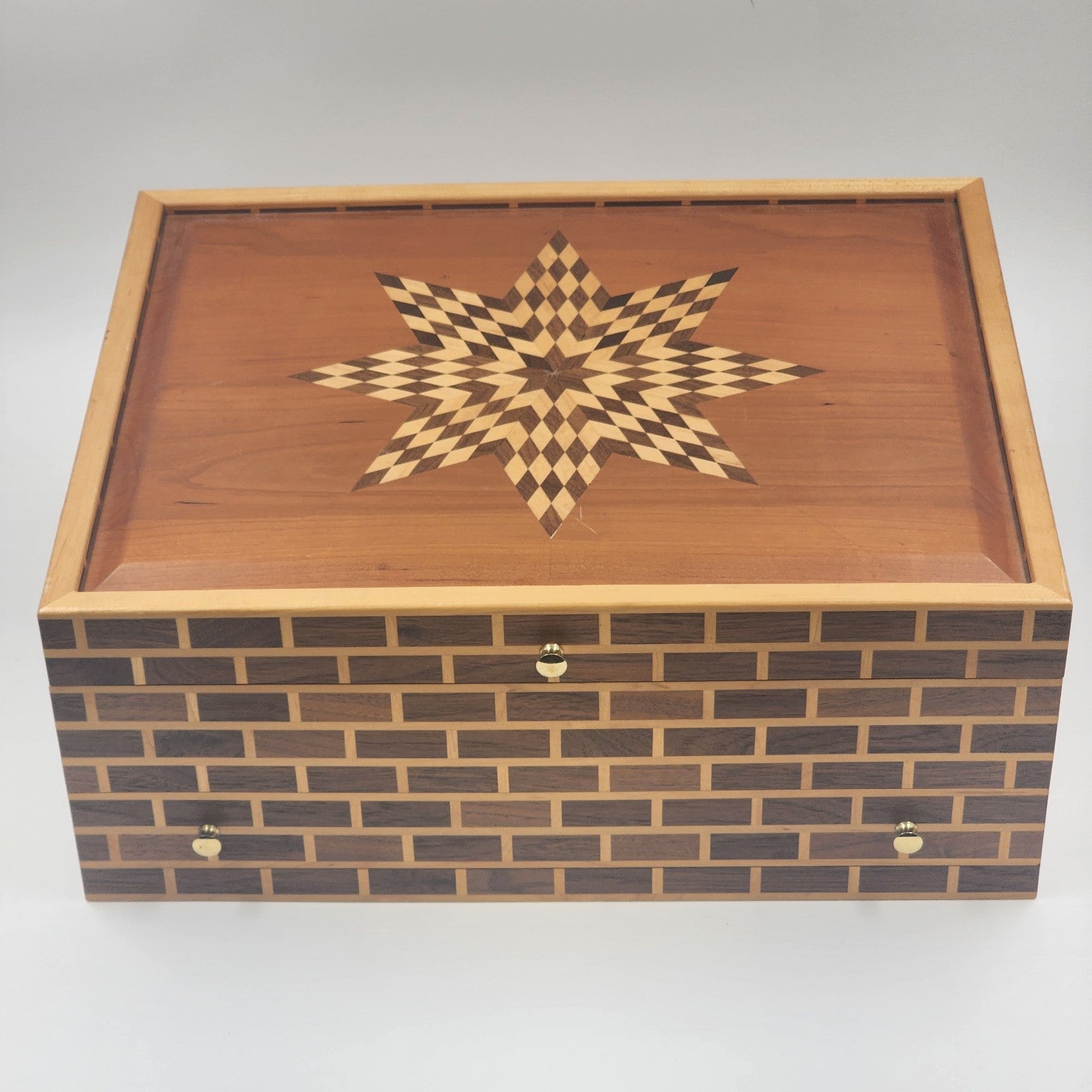 Bring the warmth and craftsmanship of Moroccan artistry to your home with this handmade Thuya wood jewelry box. Showcasing a brick-like carved design on all four sides and a stunning inlaid starburst motif on the top, this large heirloom-quality piece is as functional as it is decorative.