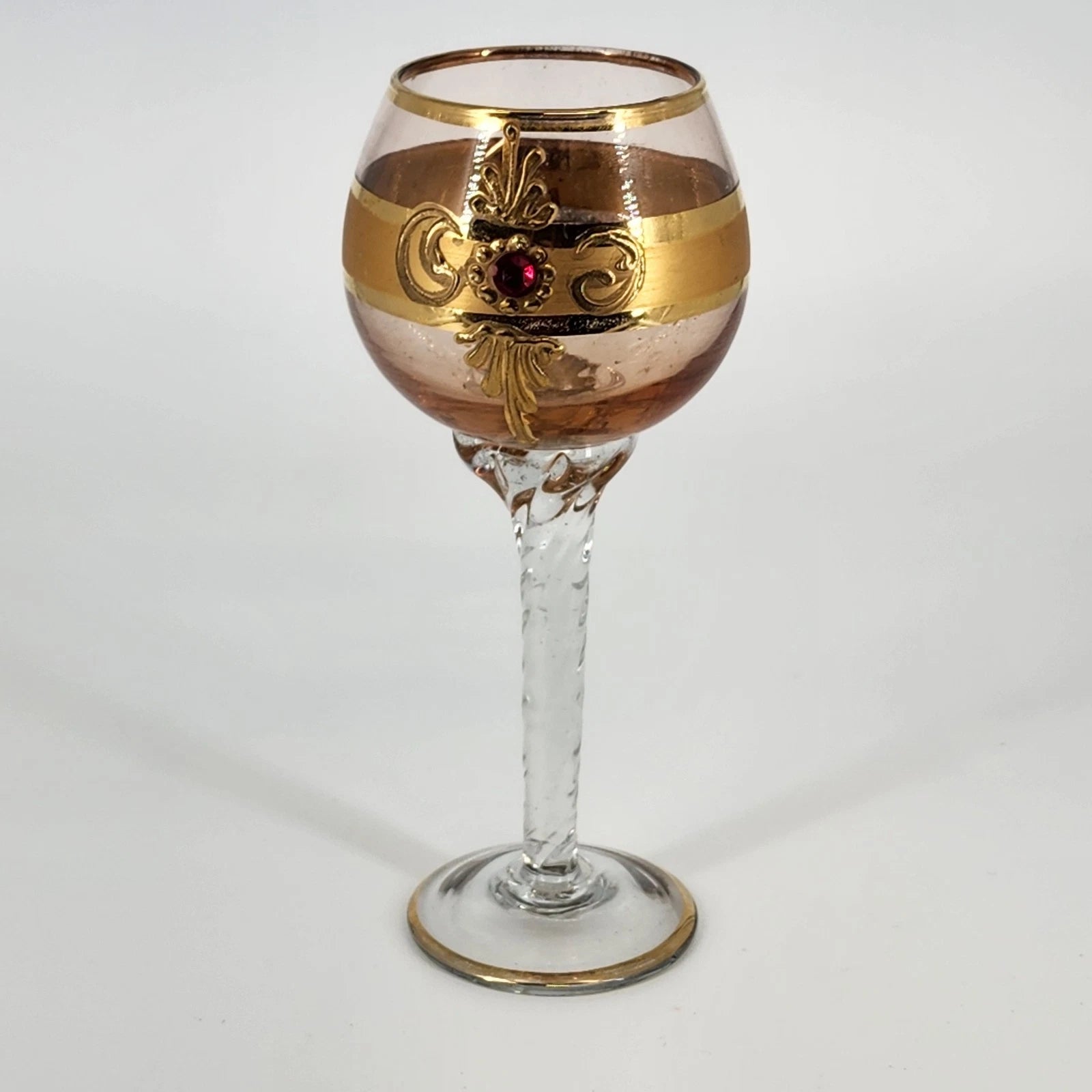 Indulge in the opulence of Venetian craftsmanship with this exquisite hand-blown Tre Fuochi Murano glass wine goblet. This stunning piece features a vibrant cranberry or pale ruby glass bowl adorned with intricate, hand-enameled raised gold scrollwork and a sparkling ruby-colored jewel accent. The design is elevated by a unique, clear twisted stem that showcases the incredible skill of Italian artisans. Combining Bohemian style with Murano tradition, this 24K gold-decorated goblet is a true work of art, perfect for a luxury barware collection or a sophisticated display.