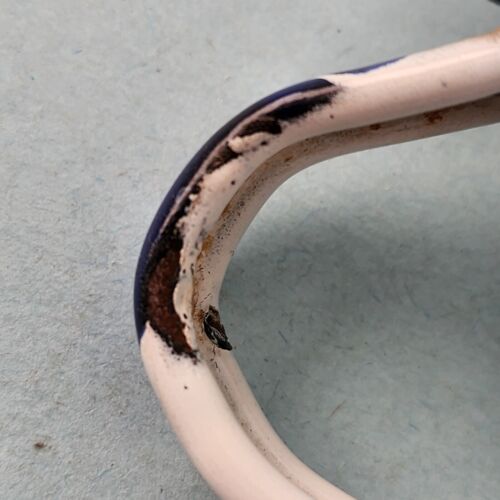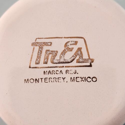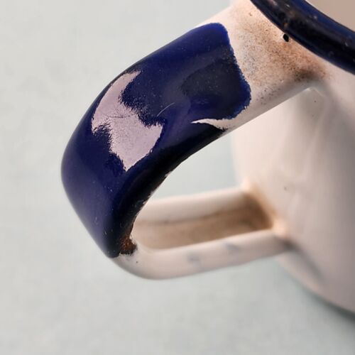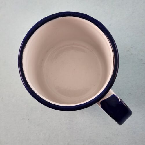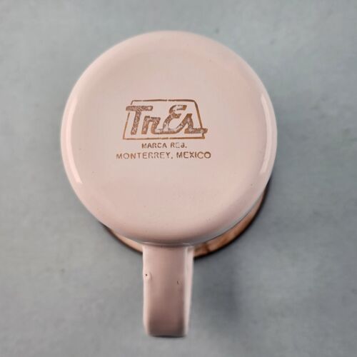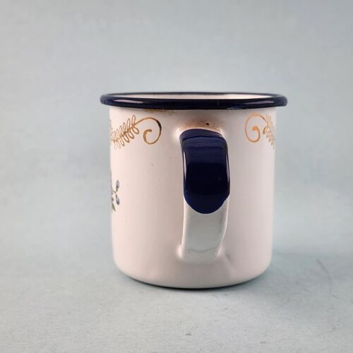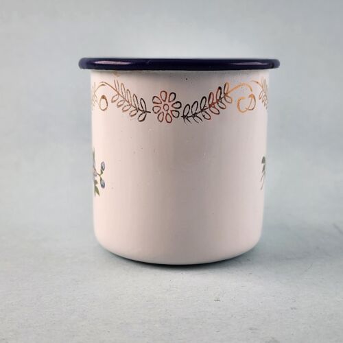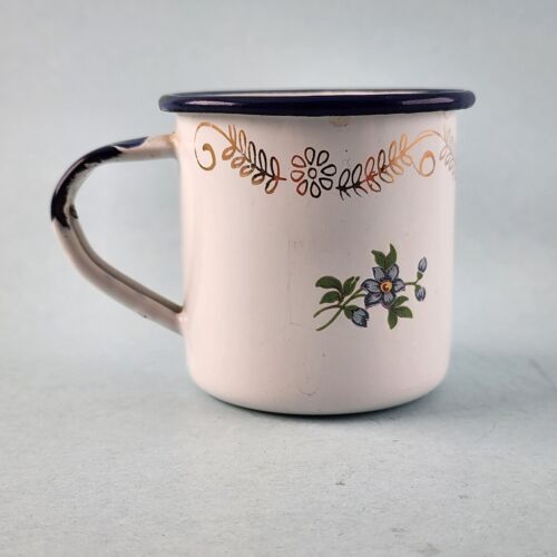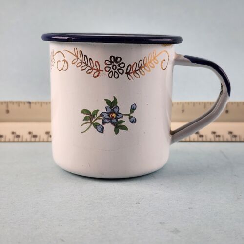 TrEs Enamel Tin Cup Small Mug Vintage Monterrey Mexico Flowers White w Blue Trim