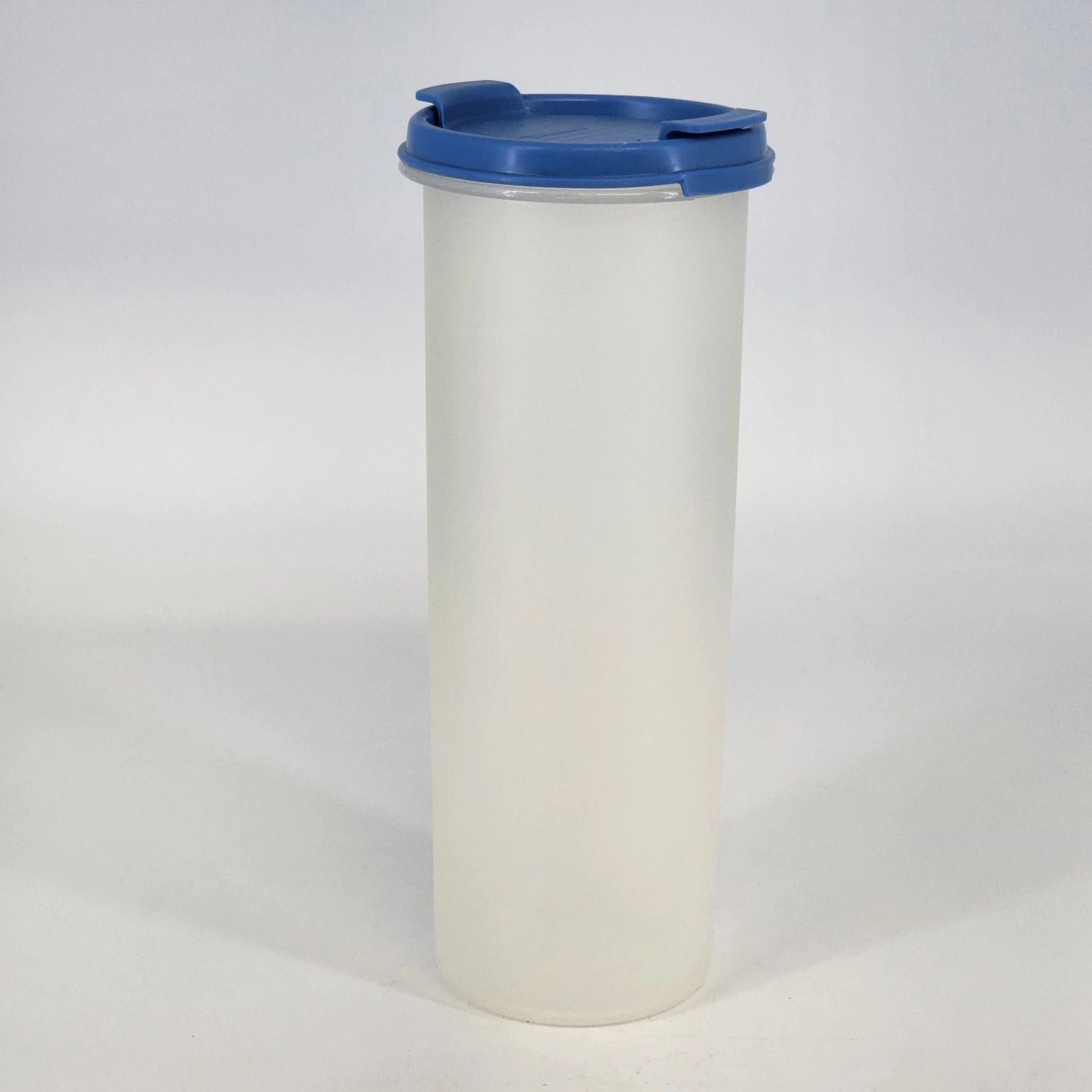 Vintage Tupperware Modular Mates Round #4 Sheer container with 1912-7 dark blue shaker lid, designed for convenient pantry and kitchen storage. With a 30 oz capacity, this container is ideal for storing dry foods such as pasta, grains, snacks, sugar, or baking ingredients while keeping them visible and organized.