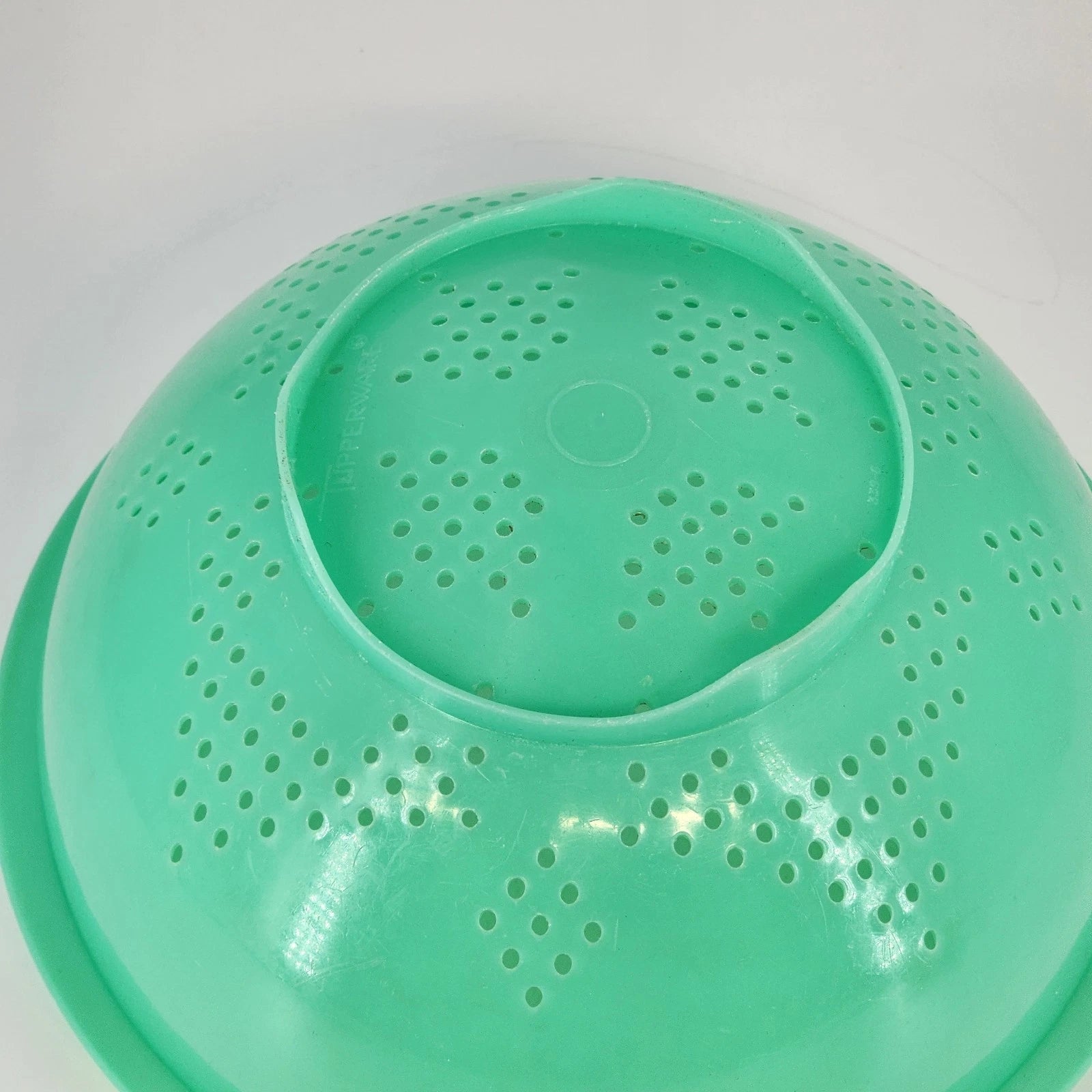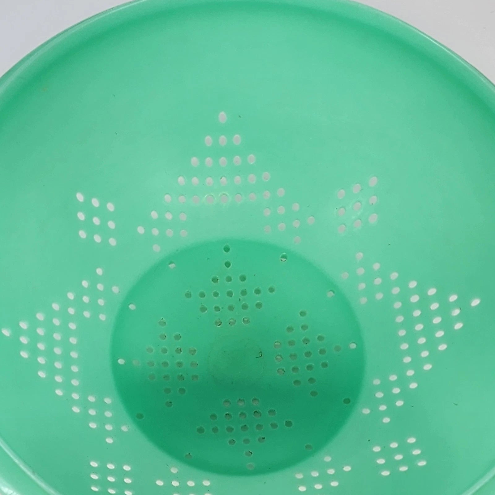 Vintage Tupperware colander strainer bowl, model 339-8, in jadeite green. Measuring 9.75 inches across and 4.75 inches high, this classic kitchen tool is ideal for washing vegetables, draining pasta, or rinsing fruits. A practical and collectible piece of vintage Tupperware.
