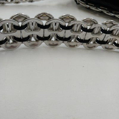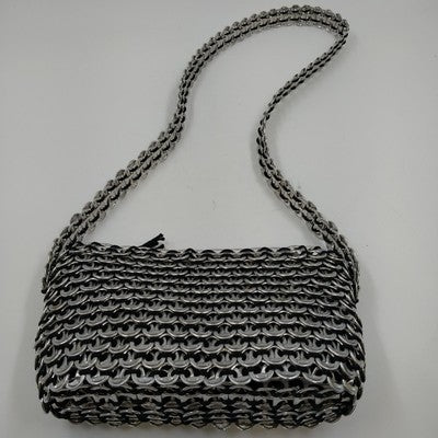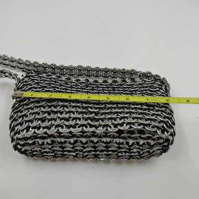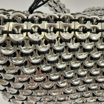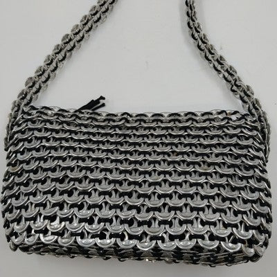 Make a bold statement with this eco-friendly and stylish clutch purse crafted from pop-top aluminum can tabs. This unique shoulder bag features a sleek silver design, a secure zipper closure, and a versatile strap for use as a clutch or shoulder bag. A standout accessory for those who value sustainability and creativity.