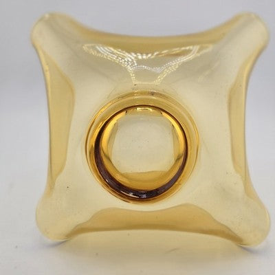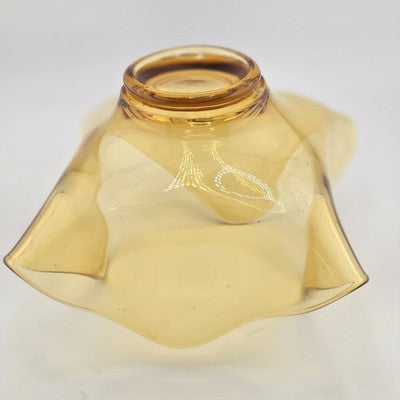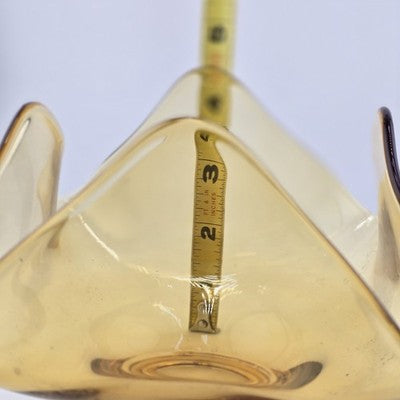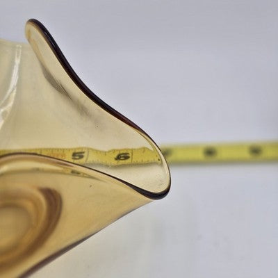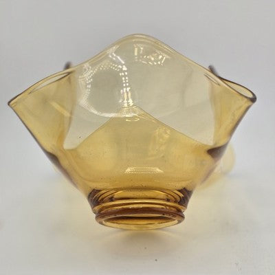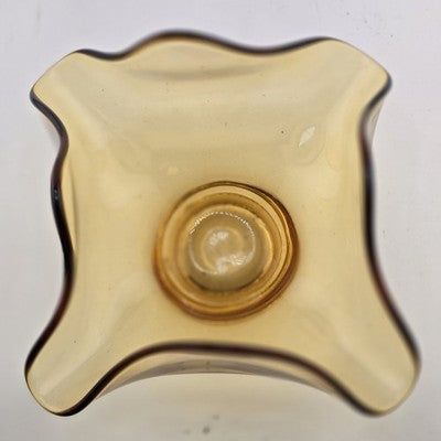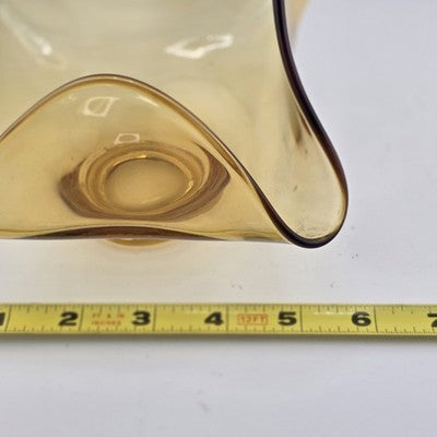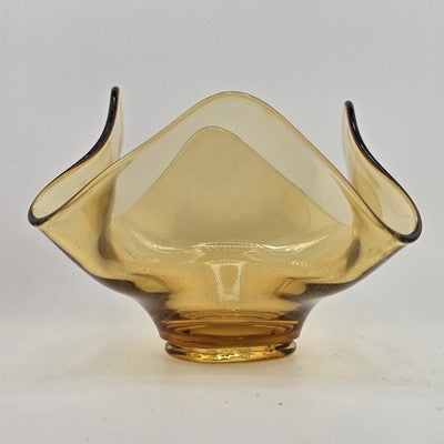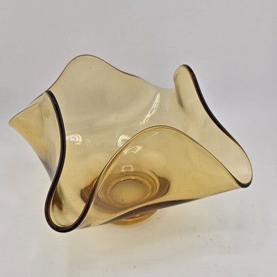 A stunning Viking Art Glass amber bowl in the Epic Loop / Handkerchief style, featuring ruffled and pinched edges. This Mid-Century Modern (MCM) piece is perfect as a candy or trinket dish and makes a beautiful display item.