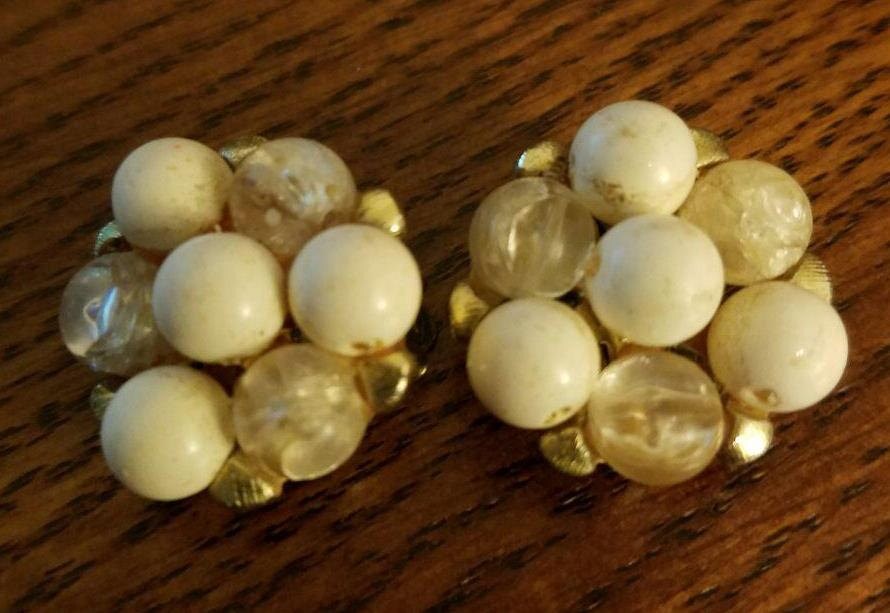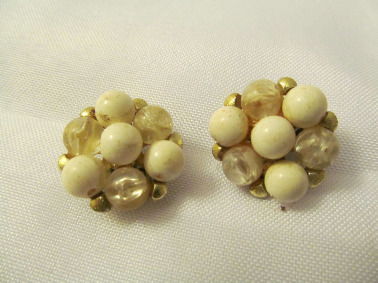 Vintage Pearl Look Bead Clip Style Earrings White & Clear