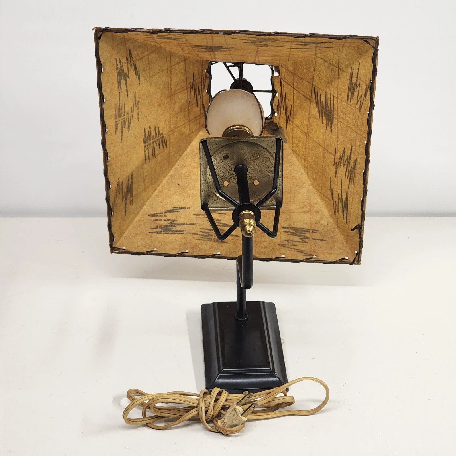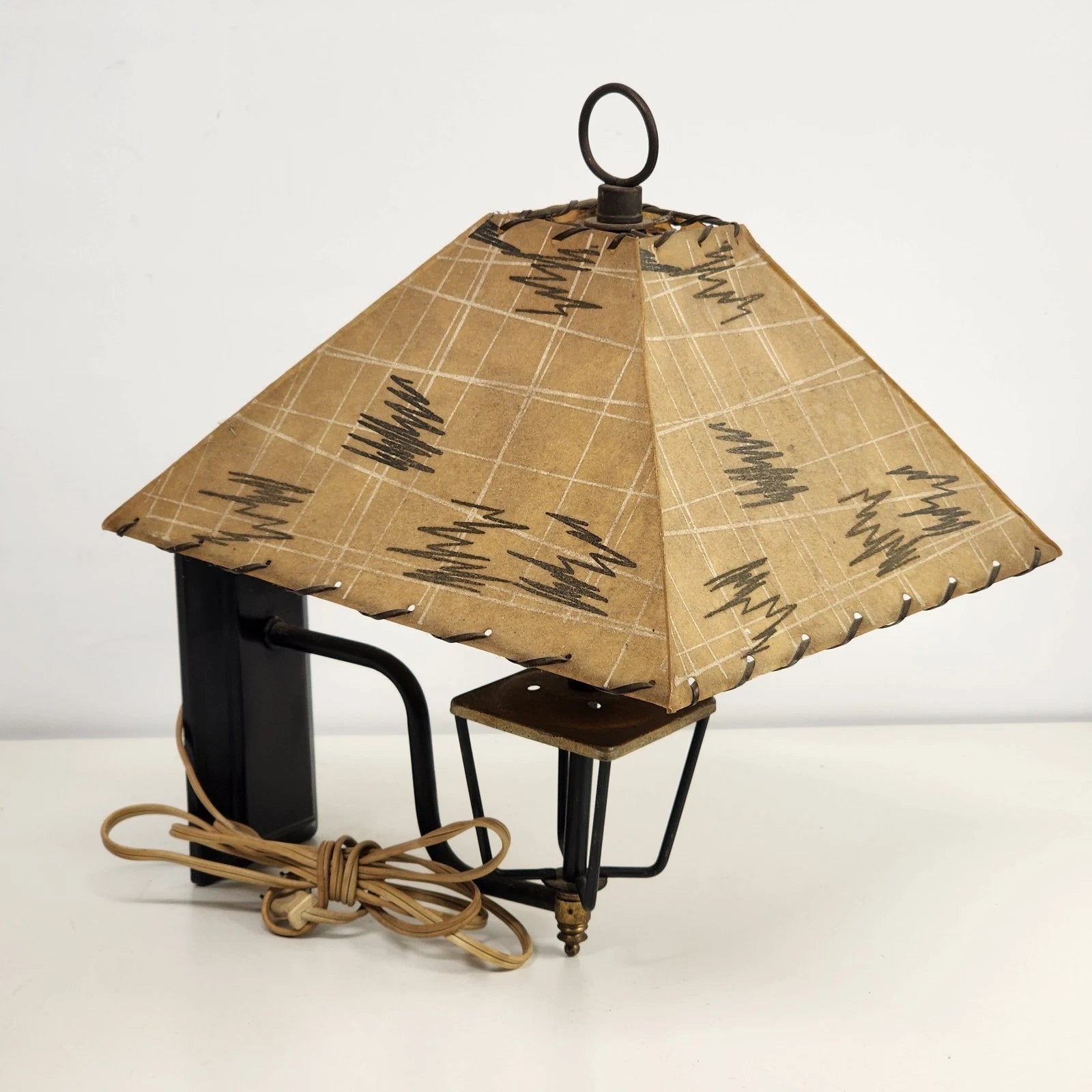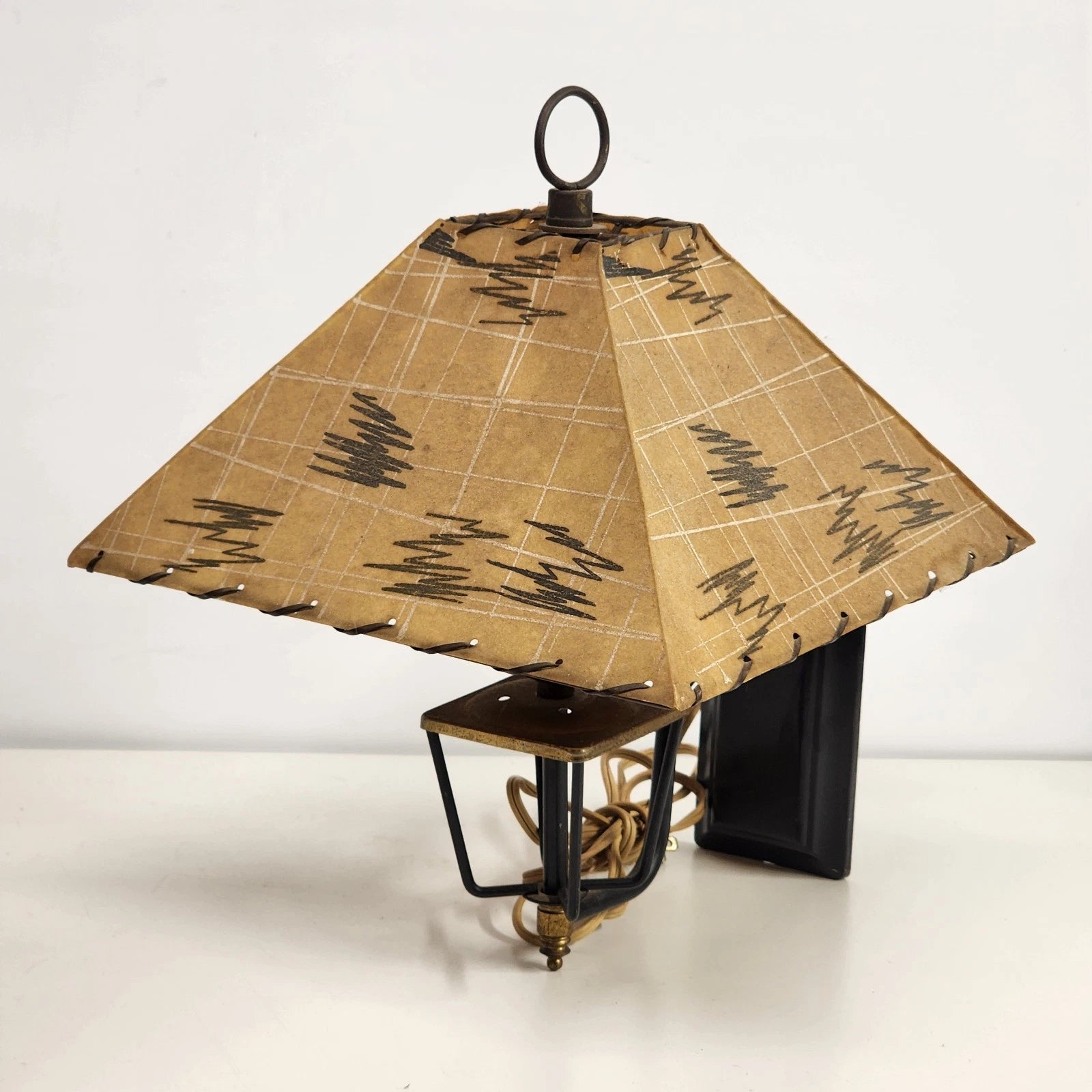Step back into the 1950s with this authentic Mid-Century Modern Wall Sconce. This lamp features the iconic trapezoid-shaped shade with hand-laced edges, mimicking the "faux rawhide" look that defined mid-century Western and Atomic decor.