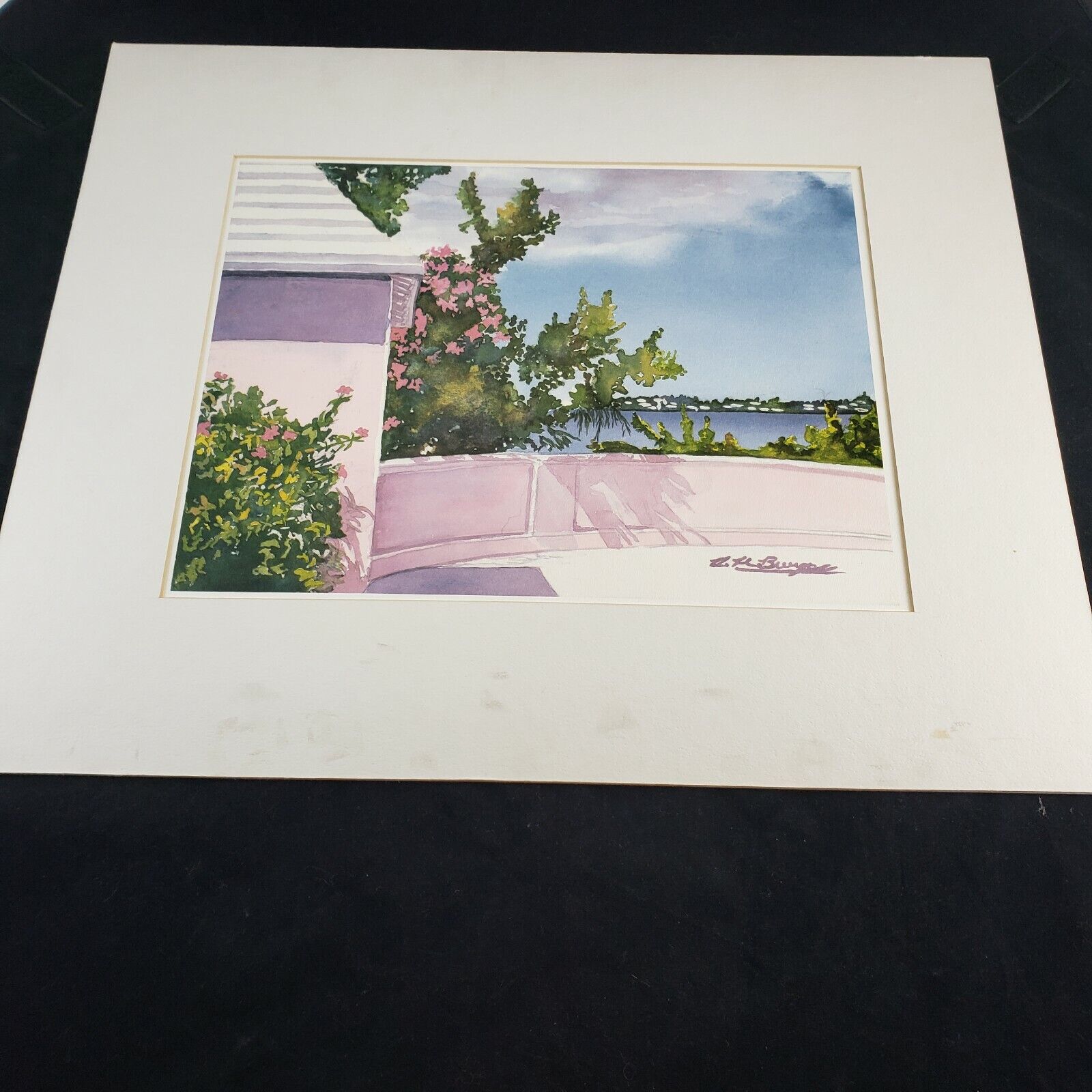 Watercolor Ocean Side Print 9" x 12" Signed with a Deck Greenery Pink Hue Matted