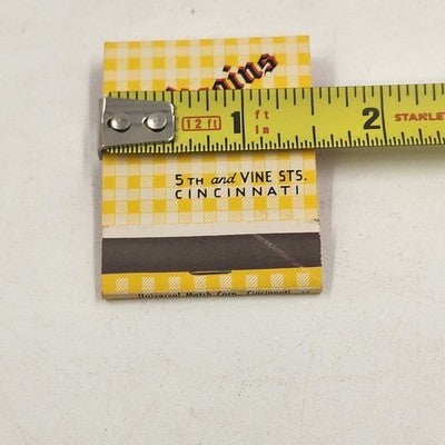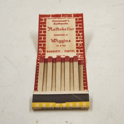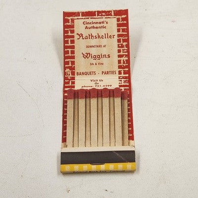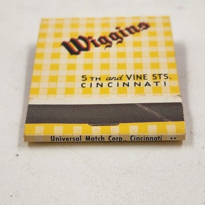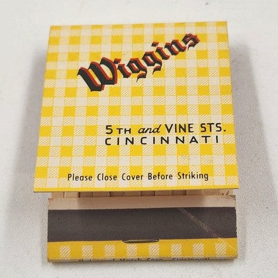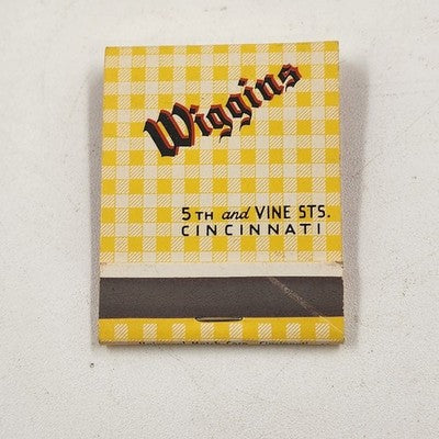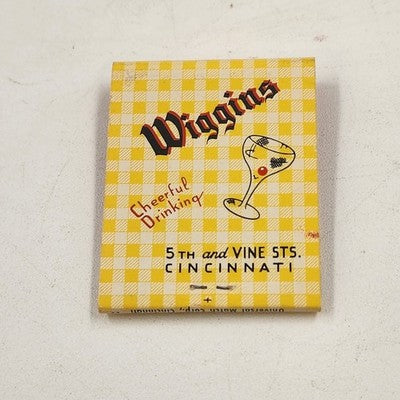 Add a piece of Cincinnati history to your collection with this vintage Wiggins Bar matchbook, featuring the fun slogan "Cheerful Drinking". Perfect for collectors of vintage matchbooks, bar memorabilia, and advertising items.