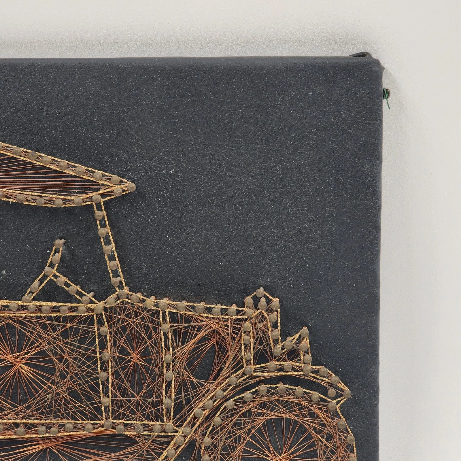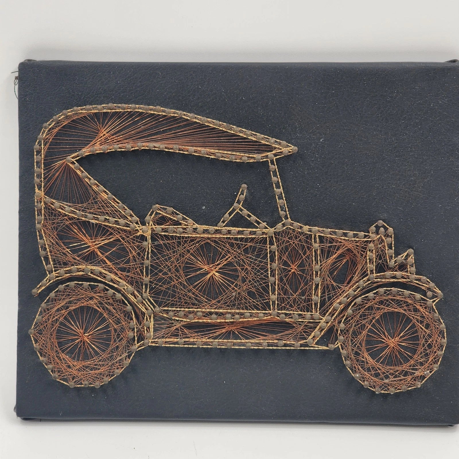 Bring timeless craftsmanship into your space with this vintage wire nail string art featuring a classic early-20th-century automobile. Intricately designed with copper and brass-tone wire over a black background, this piece blends steampunk flair with nostalgic charm. Perfect for collectors, automobilia lovers, or unique wall decor enthusiasts.