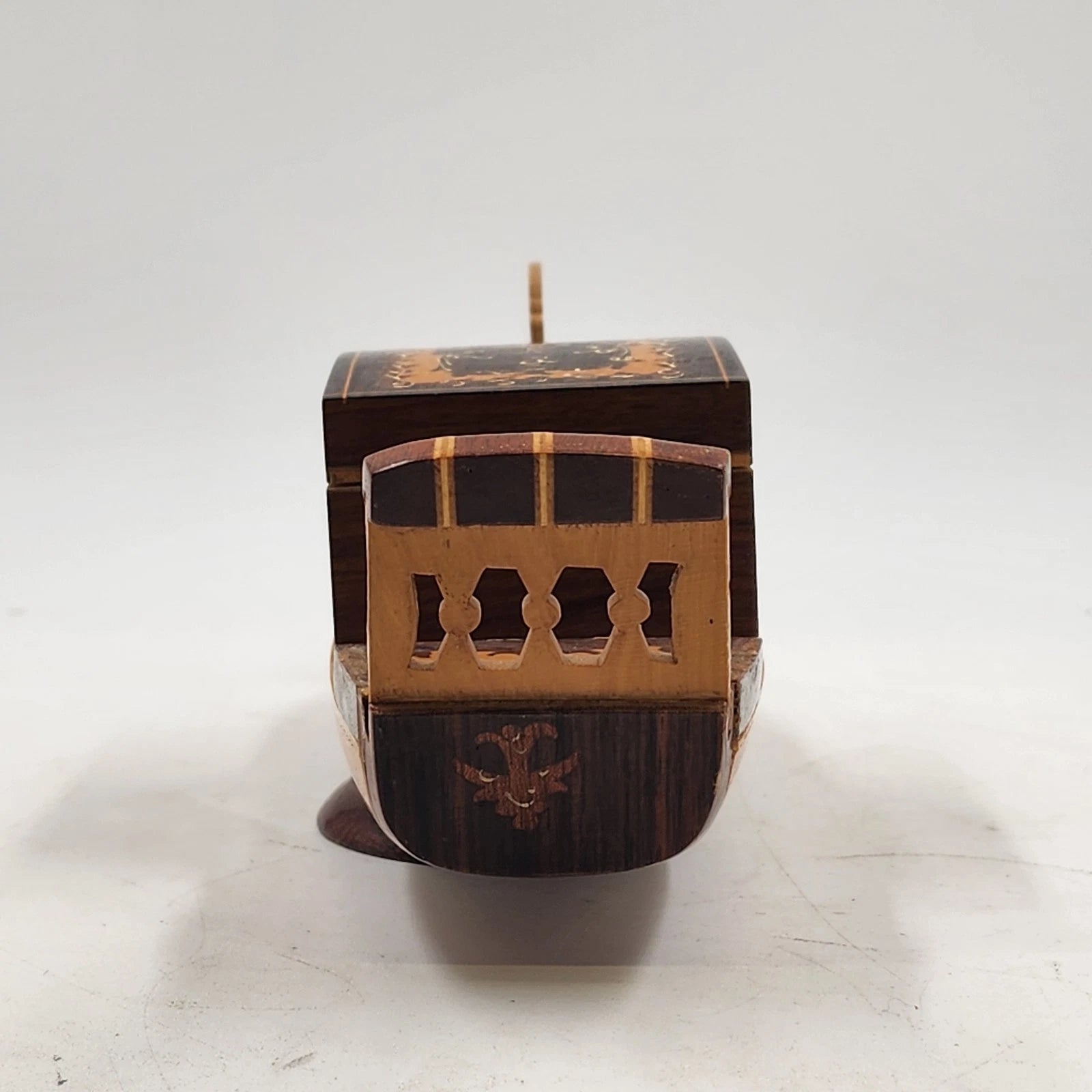 Add classic European charm to your décor with this beautifully crafted vintage wooden gondola figurine. Featuring traditional marquetry inlaid woodwork, this elegant piece showcases gondola styling and intricate detailing. Originally known as a style often used for trinket or music boxes, this one does not include a music mechanism - making it a simple and refined decorative display piece.
