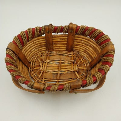 This charming woven rattan basket is perfect for picnics, fruit displays, or decorative purposes. Featuring a swivel handle and a vibrant red weaved rim, it's a delightful addition to any space.