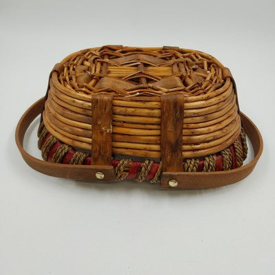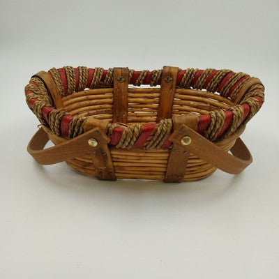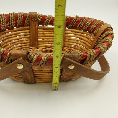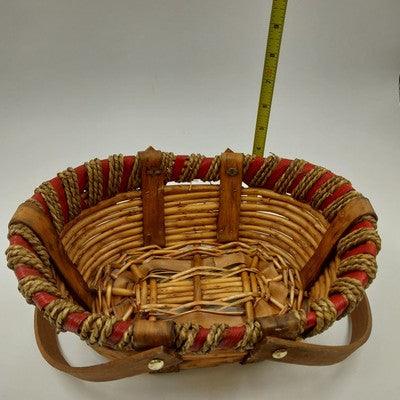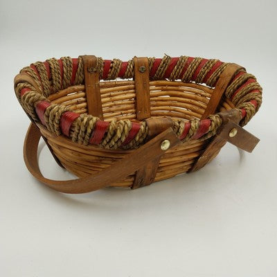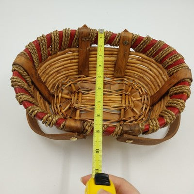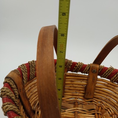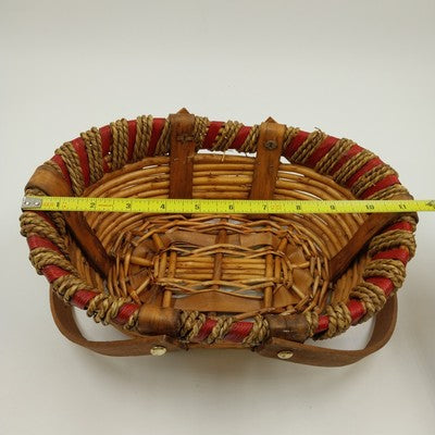 Wood Rattan Picnic Fruit Basket Swivel Handle Woven Red Rim 11x8.5"