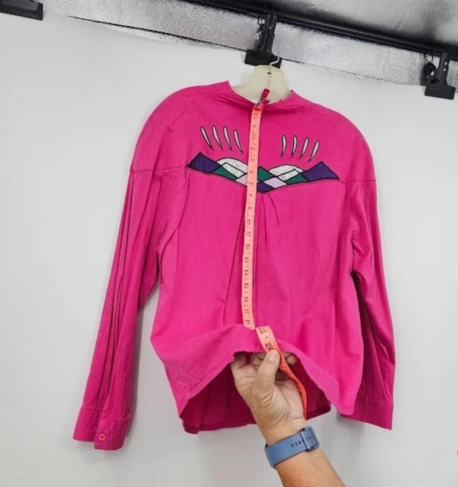 This vintage Wrangler Western cowgirl blouse from the 1990s features a soft pink color with applique detailing and a classic button-front design. A stylish and timeless piece perfect for collectors of vintage Western wear or anyone looking to add retro cowgirl charm to their wardrobe.