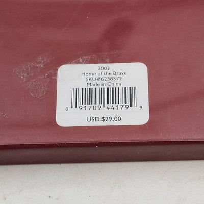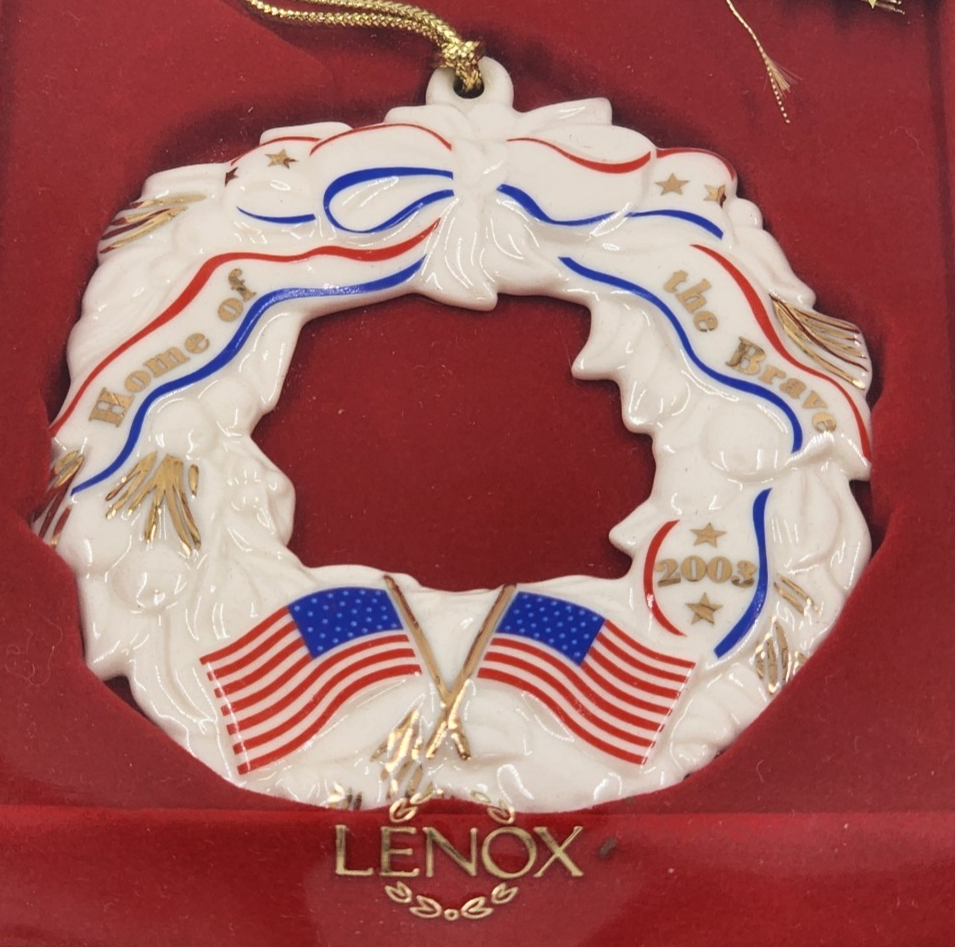 Add a touch of patriotism to your holiday décor with this Lenox USA 2003 Wreath Ornament. Featuring the phrase Home of the Brave, this vintage piece is beautifully crafted and comes with its original box. A wonderful collectible for Lenox enthusiasts or Christmas ornament collectors.