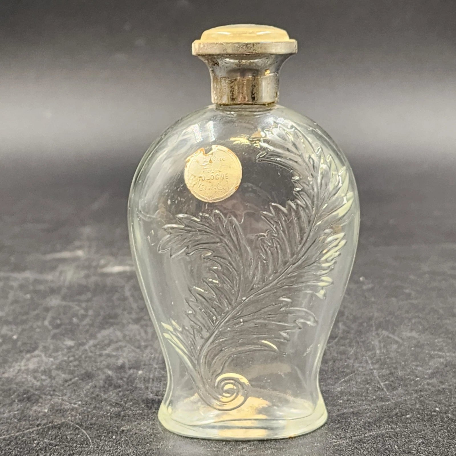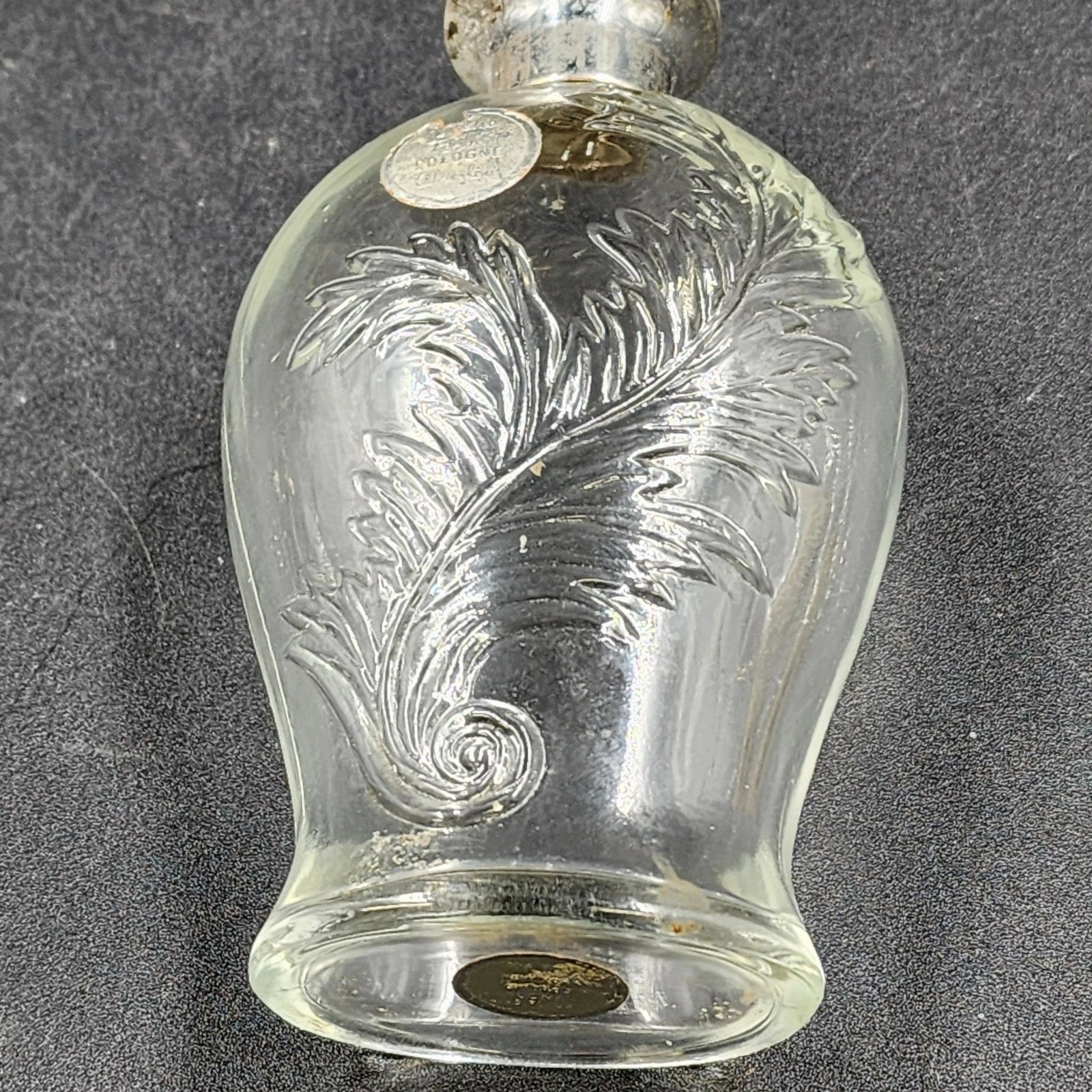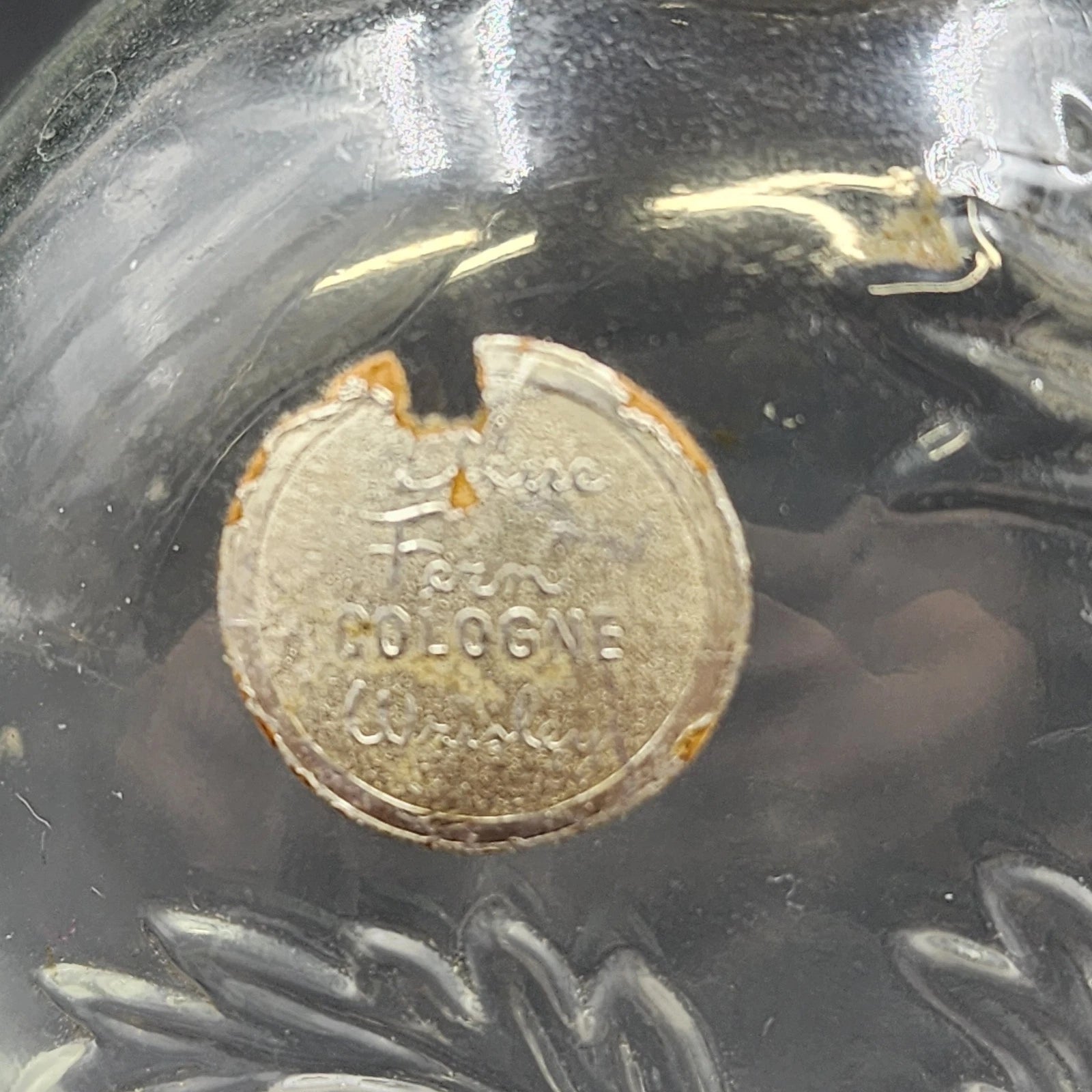 This is a beautiful vintage Wrisley Blue Fern Cologne Bottle dating back to approximately 1950. While empty, this bottle is highly collectible due to its ornate design. Crafted from clear glass, the body features an intricate, embossed leaf or fern pattern, complemented by a metallic, likely silver-tone, lid. It's a charming piece for display on a vanity or dressing table.