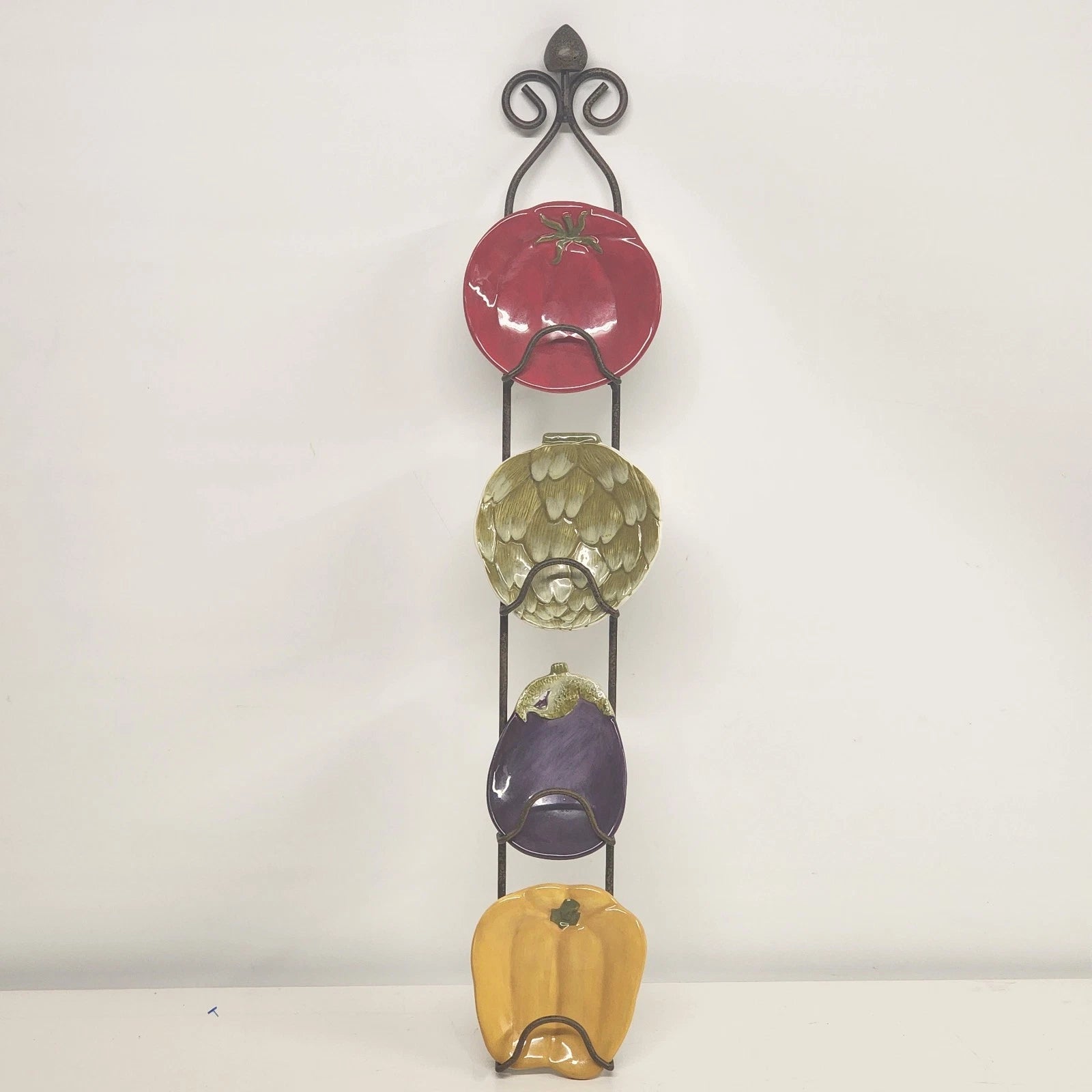 Decorative kitchen wall display featuring a 4-piece ceramic vegetable plate set displayed in a vertical wrought iron wall hanger. Each plate showcases a colorful vegetable motif, creating a charming farmhouse or country-style accent perfect for kitchens, dining areas, or pantry walls.