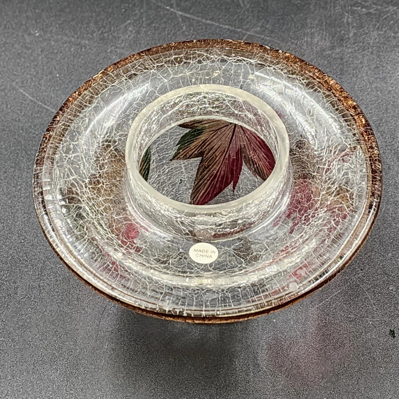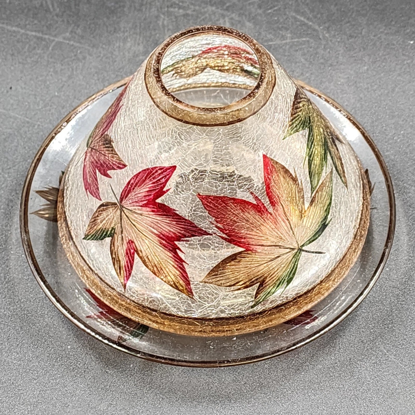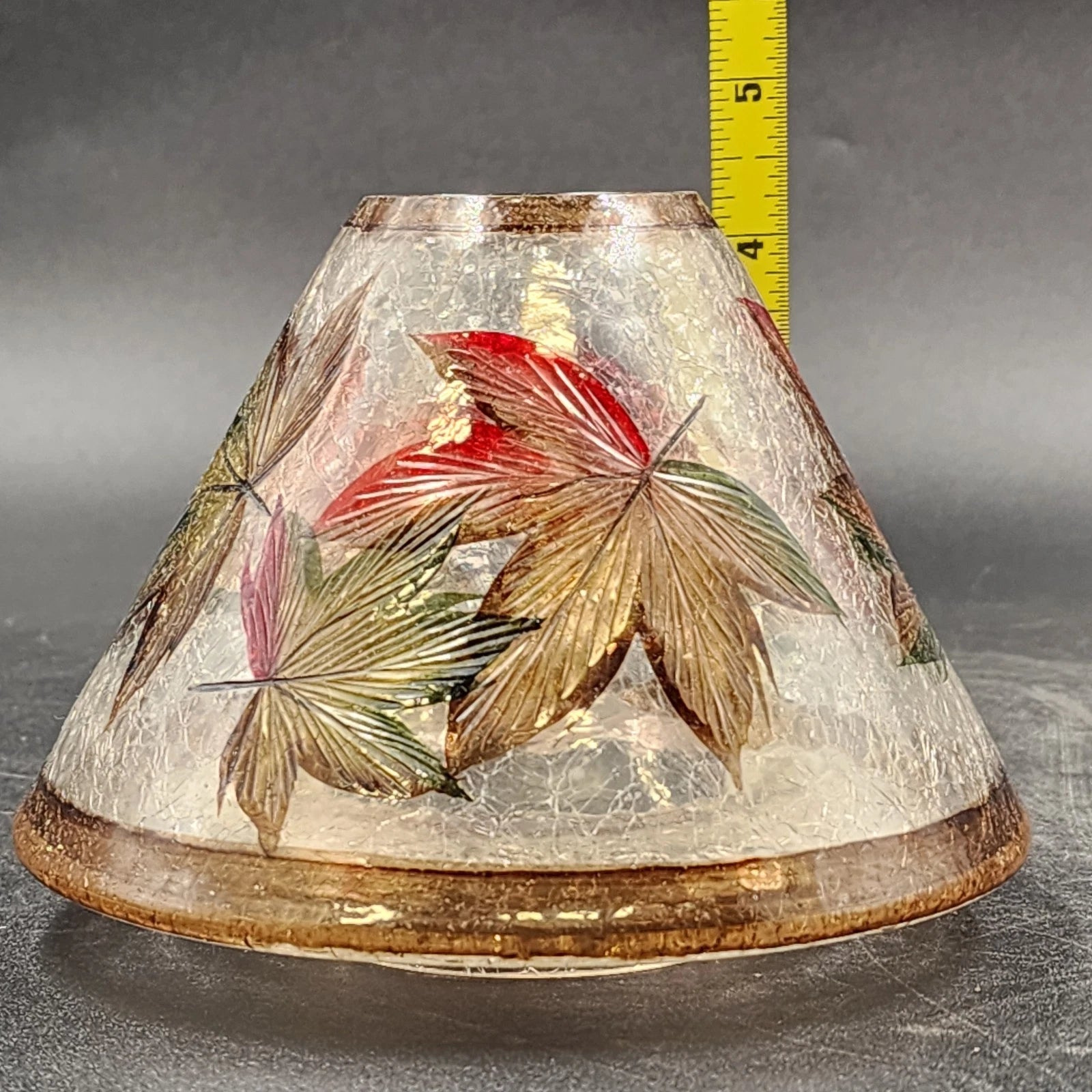 Add a warm seasonal touch to your décor with this Yankee Candle large jar shade and matching underplate, featuring a beautiful brown crackle glass finish with autumn maple leaves. Designed to sit over large Yankee jar candles, this shade helps reduce drafts and promotes an even burn.