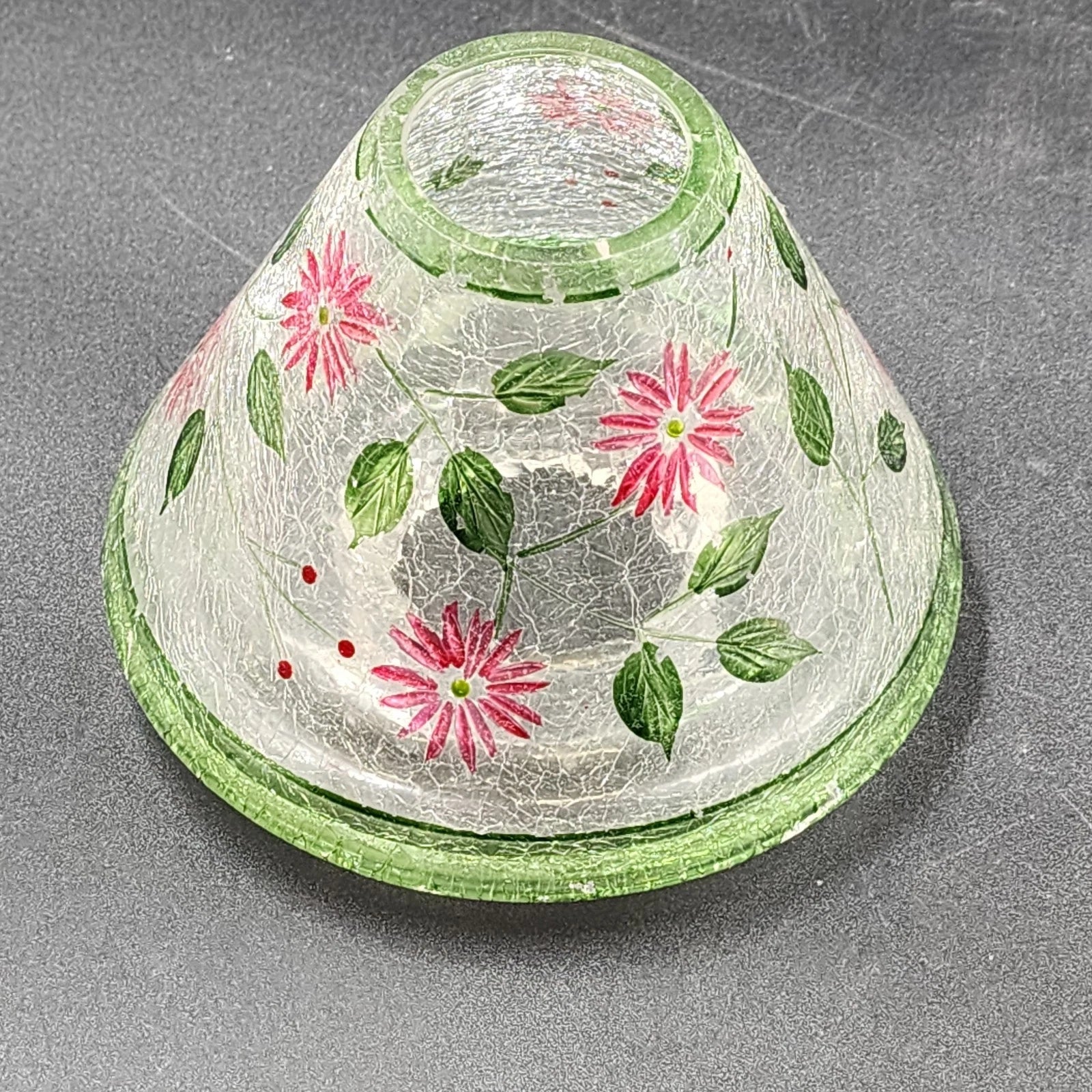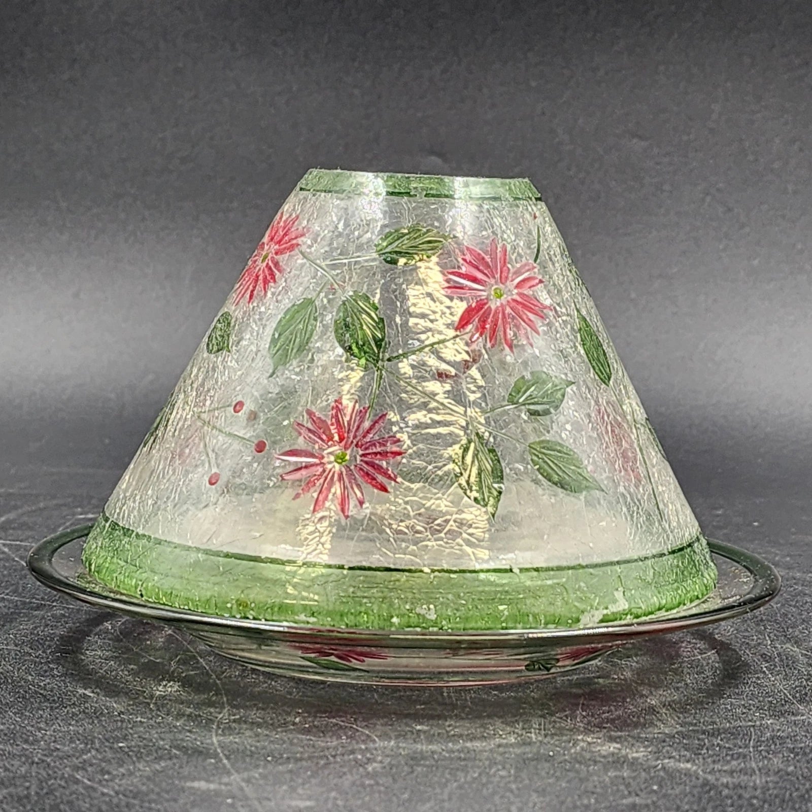 Beautiful Yankee Candle large jar shade and matching underplate featuring crackle glass with pink flowers and green vines. Adds elegance and charm to any candle display. Fits standard large Yankee Jar candles. No chips or cracks.