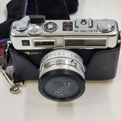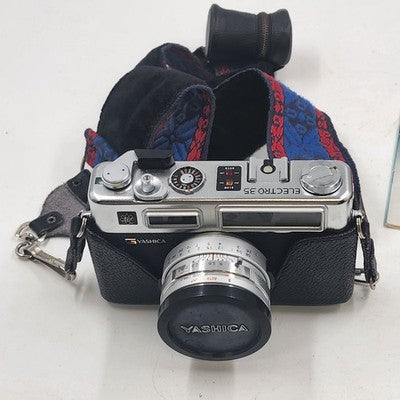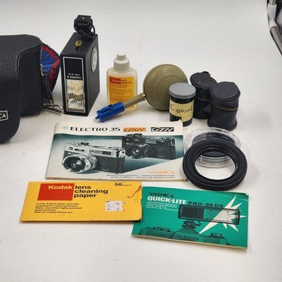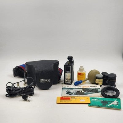 Capture timeless moments with this Yashica Electro 35 35mm film camera set. This iconic rangefinder camera comes with its original case, flash unit, power cord, instruction manual, and a camera bag, making it perfect for collectors or film photography enthusiasts. A classic blend of form and function from the golden era of film.