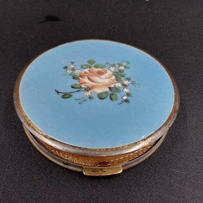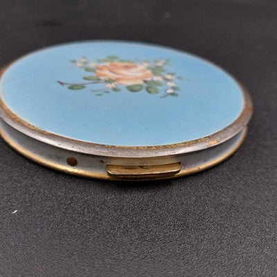 This vintage guilloché enamel compact is a stunning example of Art Deco craftsmanship, likely dating to the 1920s. The compact features a brilliant blue guilloché enamel lid, detailed with a hand-painted rose and floral motif. Guilloché enamel involves engraving intricate patterns onto metal, then covering them with translucent enamel, creating a shimmering, light-reflective surface.